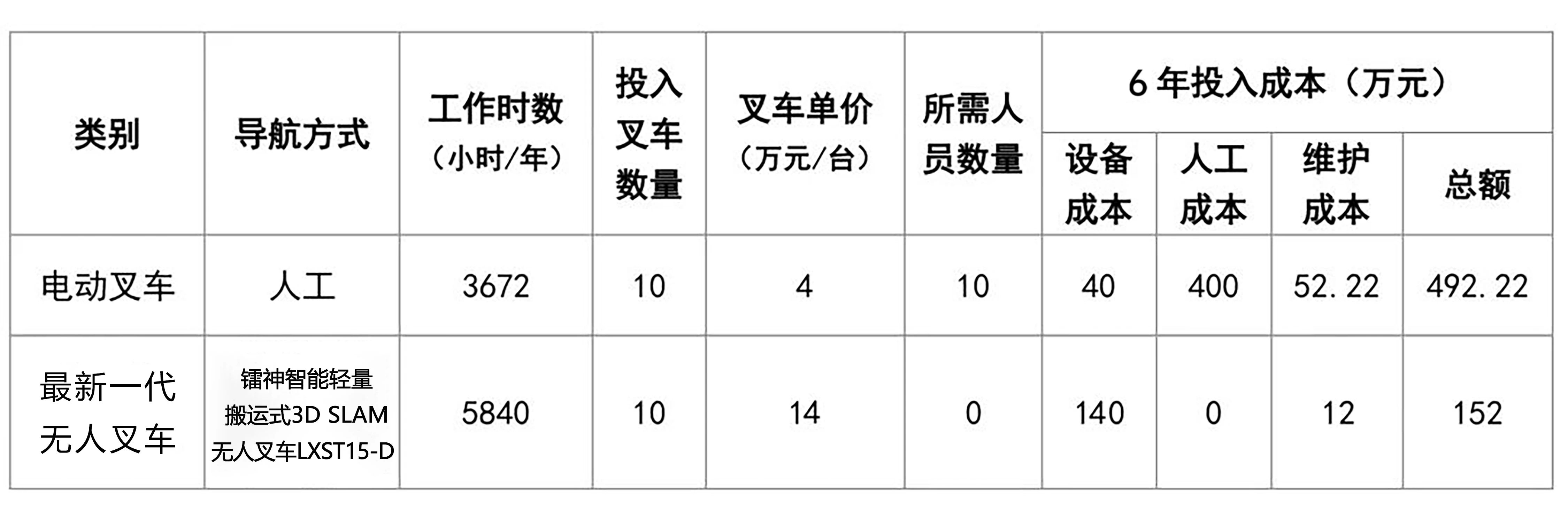 上表假定某仓库分别投入10辆电动叉车、以pg电子游戏试玩平台网站智能轻量搬运式3D SLAM无人叉车LXST15-D为例,并以6年折旧进行投资回报对比分析。采用pg电子游戏试玩平台网站智能LXST15-D无人叉车,6年总投入成本仅152万,比人工电动叉车节省了69%的投入成本、59%的时间成本。